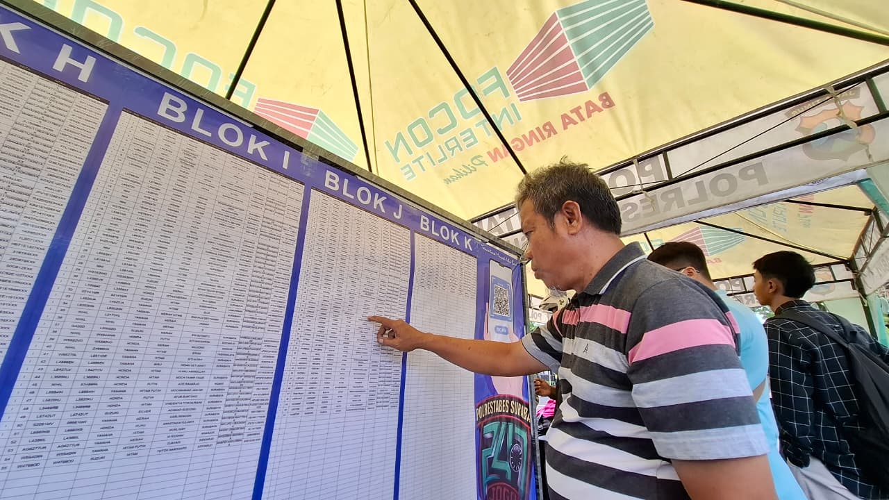 Salah seorang warga mengecek data kendaraan yang hilang di Lapangan B Mapolrestabes Surabaya, Rabu (21/1/2026). Foto: Akira suarasurabaya.net
