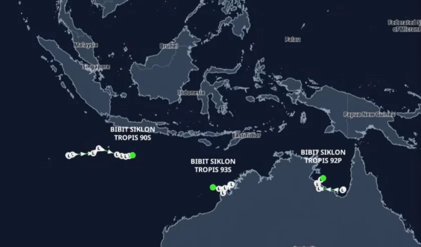 Dua bibit siklon tropis, yakni 93S dan 95W di sekitar wilayah Indonesia berpotensi meningkatkan curah hujan di sejumlah daerah pada Senin (9/3/2026).