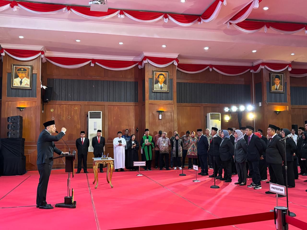 Eri Cahyadi Wali Kota Surabaya memberi selamat ke 78 pejabat Pemkot Surabaya yang dirotasi hari ini, Kamis (2/4/2026). Foto: Meilita Elaine suarasurabaya.net