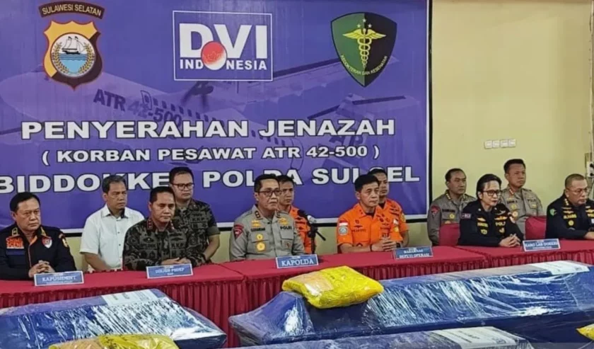 Konferensi pers hasil identifikasi korban kecelakaan pesawat ATR 42-500 milik perusahaan Indonesia Air Transport (IAT) berlangsung di di Posko DVI Biddokkes Polda Sulsel pada Sabtu (24/1/2026). Foto: Antara