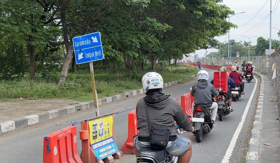 Meski terjadi peningkatan volume, tidak terlihat adanya penumpukan kendaraan di jalur roda dua. Arus lalu lintas terpantau ramai lancar.