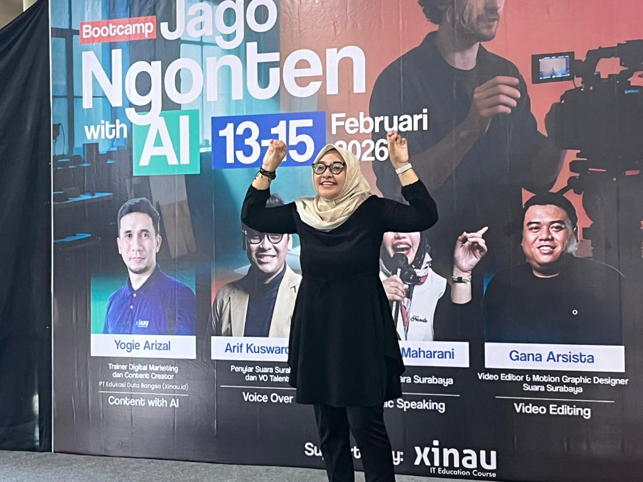 Hari ketiga Suara Surabaya Academy Bootcamp Jago Ngonten with AI dimulai dengan senam diafragma khas Radio Suara Surabaya, Minggu (15/2/2026).