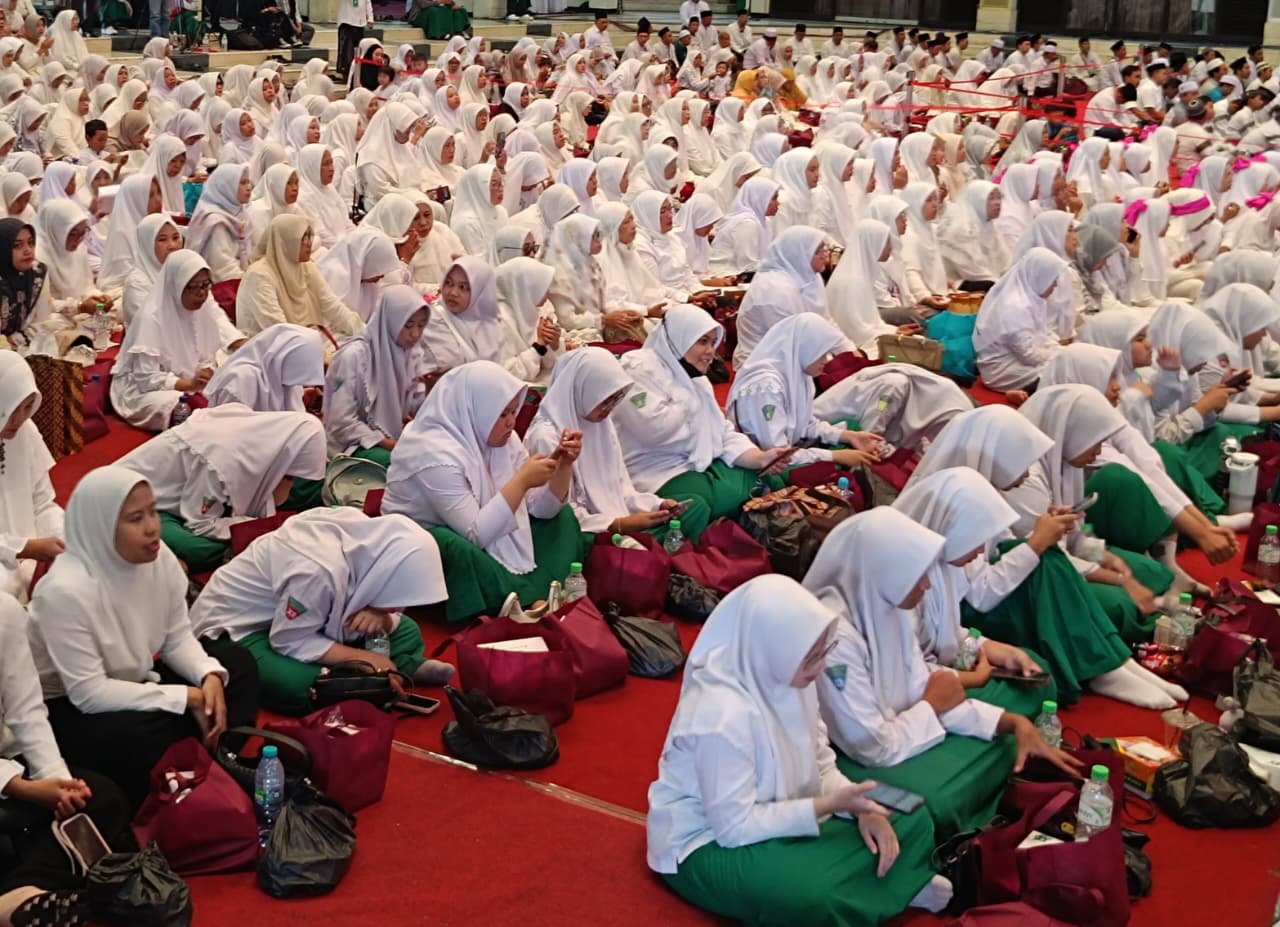 Ratusan murid jenjang TK hingga SMA dari Yayasan Taman Pendidikan dan Sosial Khadijah, memperingati Haul KH Abdul Wahab Turcham di Gedung Islamic Center, Surabaya pada Minggu (25/1/2026).