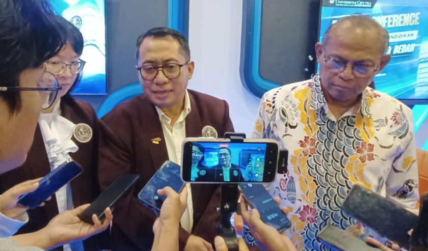 Wirawan Endro Dwi Radianto Rektor Universitas Ciputra (UC) Surabaya bersama Billy Daniel Messakh Kepala Dinas Kesehatan (Dinkes) Kota Surabaya saat memberi pernyataan soal tantangan menjawab kebutuhan dokter spesialis di UC Surabaya, pada Sabtu (18/4/2026). Foto: Risky suarasurabaya.net