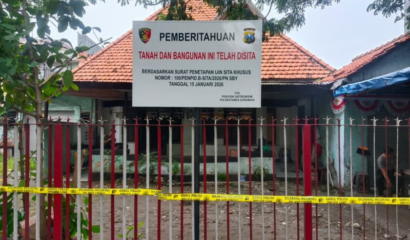 Pagar bangunan tersebut kini telah dipasang garis polisi dan papan informasi penyitaan bangunan dan lahan yang bertuliskan: Berdasarkan Surat Penetapan Ijin Sita Khusus Nomor: 190/PENPID.B-SITA/2026/PN SBY yang ditandatangani Penyidik Satreskrim Polrestabes Surabaya.