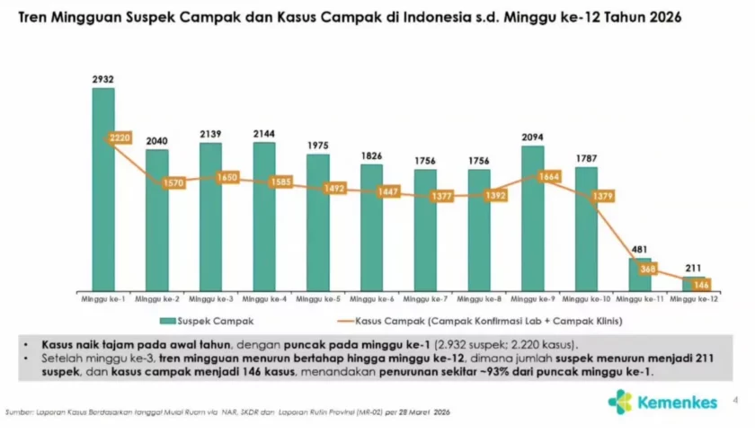 Penurunan angka kasus campak di Indonesia tercatat sebesar 93 persen di minggu ke-12 tahun 2026. Puncak kasus pada minggu pertama tercatat sebanyak 2.220 kasus dan saat ini turun drastis menjadi 146 kasus pada pertengahan Maret.