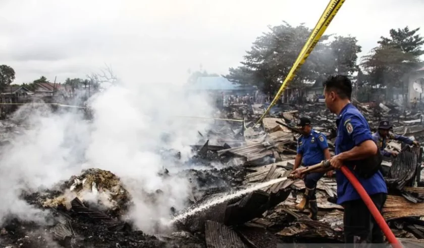 Petugas pemadam kebakaran melakukan pendinginan lokasi kebakaran permukiman dan bangunan sekolah di Kelurahan Kasongan Lama, Kabupaten Katingan, Kalimantan Tengah, Senin (26/1/2026). Foto: Antara