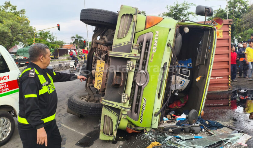 Seorang pemotor meninggal dunia setelah tertimpa truk muat kontainer yang terguling di Bypass Jabaran, Balongbendo, Sidoarjo, Rabu (14/1/2026) sekitar pk. 15.40 WIB.