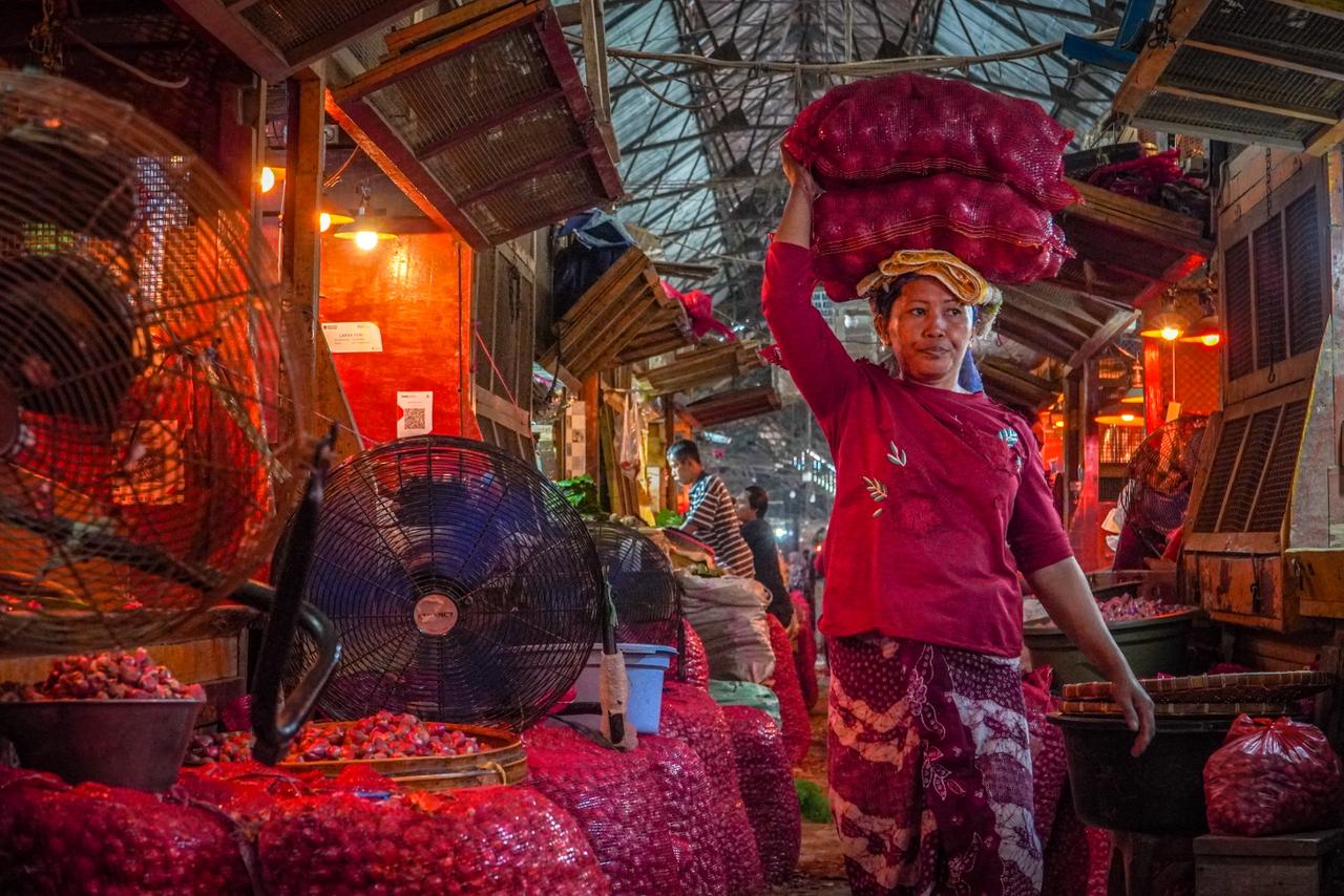 Seorang pedagang sedang mengangkut karung bawang di Pasar Pabean Surabaya pada Kamis (26/3/2026). Foto: Rafi’ Ermawan Mg suarasurabaya.net