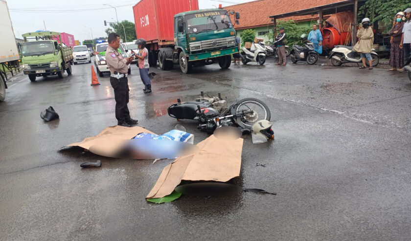 Pemotor dan penumpangnya meninggal dunia usai motor yang ditumpangi tergelincir dan kemudian terlindas truk tronton saat melintas di Jalan Raya Arteri Pamotan, Desa Pamotan, Kecamatan Porong, Sidoarjo, Kamis (15/1/2026) sore.