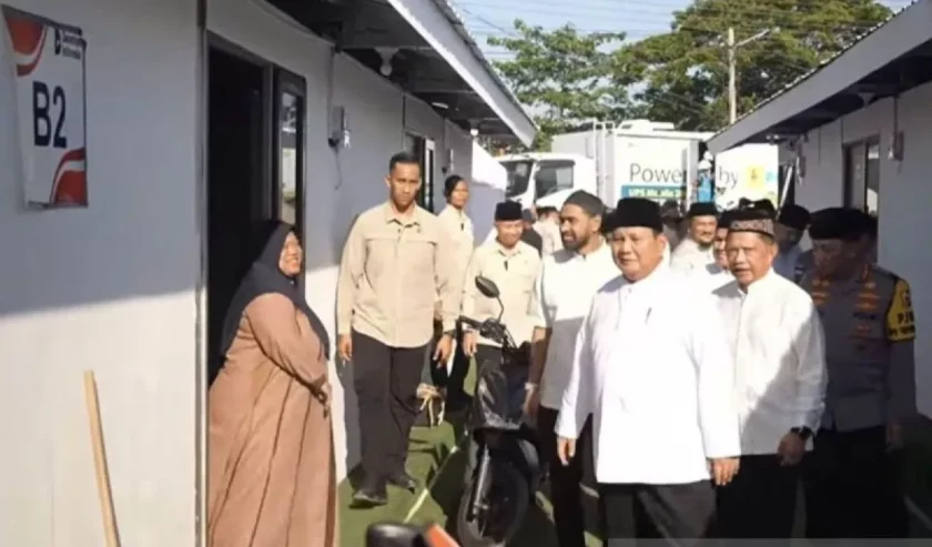 Melansir Antara, Prabowo Presiden tiba di lokasi huntara setelah melaksanakan halal bihalal dengan jamaah Masjid Darussalam dan warga sekitar.