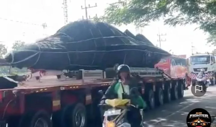 Potongan gambar video viral di media sosial yang menunjukkan rangkaian bagian pesawat tempur T50i yang dikirim menggunakan truk, Jumat (13/2/2026). Foto: Antara/Potongan layar video akun media sosial