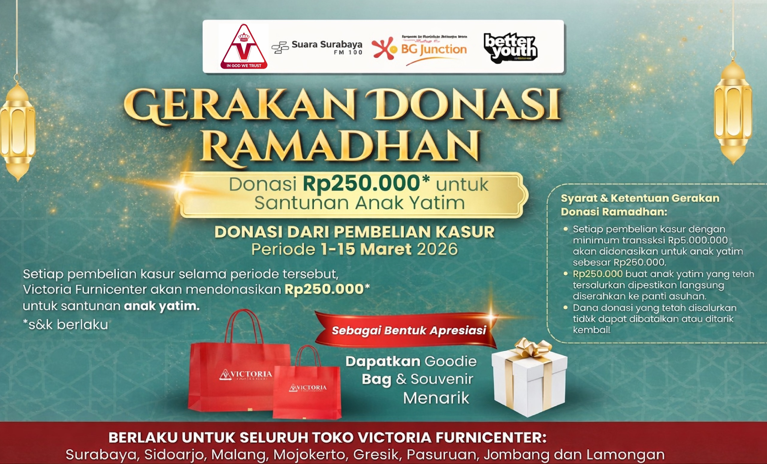 Program Gerakan Donasi Ramadan 2026 juga didukung oleh berbagai brand kasur ternama yang tersedia di Victoria Furnicenter, di antaranya: King Koil, Serta, Florence, Spring Air, Therapedic, Comforta, Spinno, Lady Americana, Elite, Ocean, dan Procella.