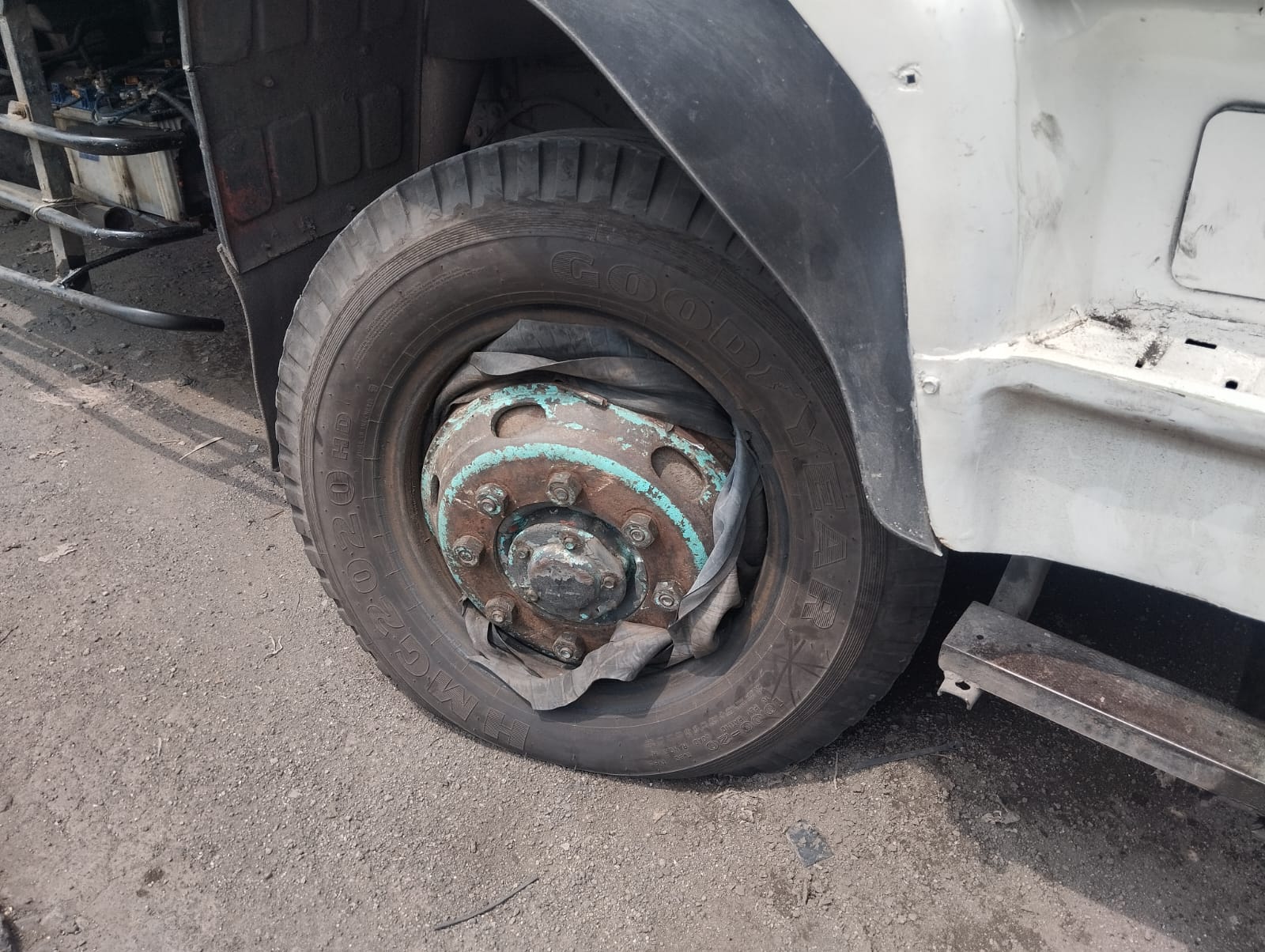 Ban truk yang cincin velgnya terlepas saat dipompa Senin (2/3/2026). Foto: AKP Ali Mubarok via WA SS