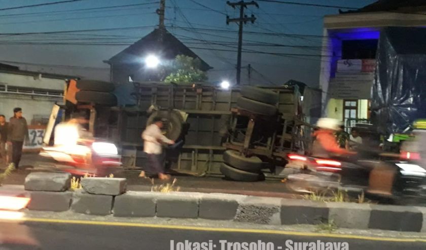 18.30: Info awal: Gandengan belakang truk terguling di dekat SPBU Trosobo – Surabaya di lajur kiri. Waspada, Kawan. Sebaiknya ambil lajur kanan. (odp-rt)