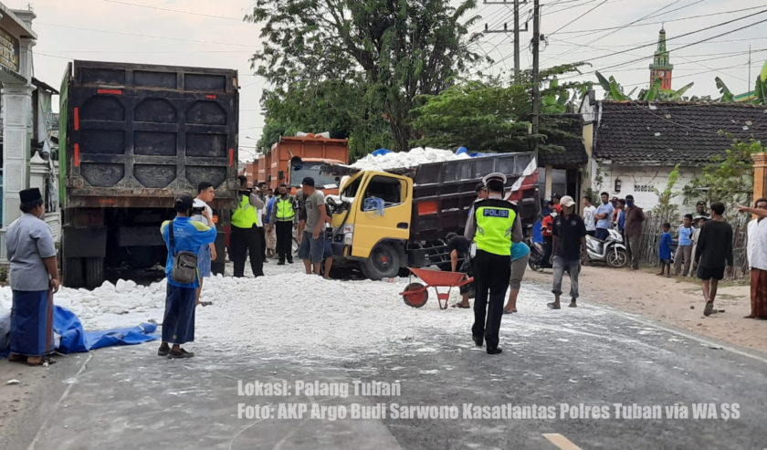 9.17: Kecelakaan melibatkan dump truk E 9445 vs dump truk tronton B 9476 PYU di Palang Tuban, Selasa (4/8/20) jam 6.40. AKP Argo Budi Sarwono Kasatlantas Polres Tuban menjelaskan, dump truk plat E yang berjalan dari timur ke barat bannya pecah. Karena pengemudi tidak bisa menguasai kemudi, akhirnya terjadi tabrakan dengan dump truk tronton plat B yang berjalan dari arah sebaliknya. Imbas kejadian ini, pengemudi dump truk bernama Agus Purnomo mengalami patah kaki. Dua kendaraan yang terlibat sudah di evakuasi. (odp-rt)