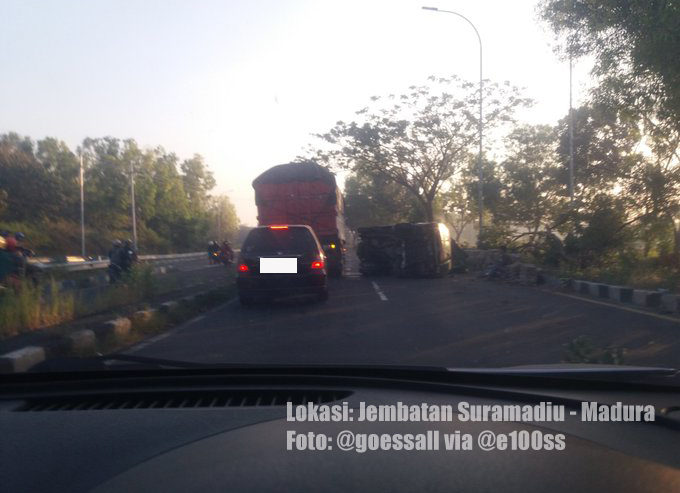 8.50: Info awal: Mobil muat telur terguling setelah Jembatan Suramadu – Madura. Belum jelas bagaimana kronologinya. (odp-rt)