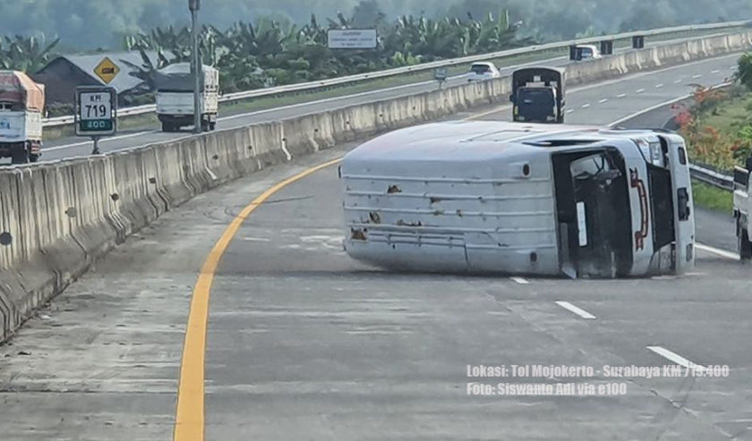 16.31: Info awal: Mobil terguling di tol Mojokerto – Surabaya KM 719.400. Lalu lintas padat. Sudah ada petugas di lokasi (odp-rt)