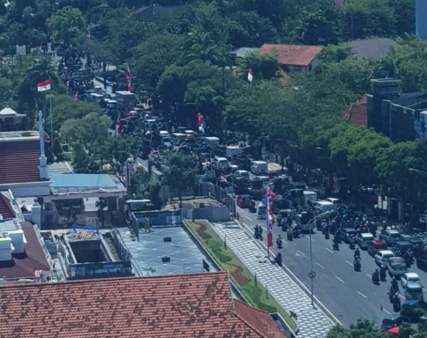 11.23: Update: Rombongan unjuk rasa dari depan Grahadi mulai bergerak ke arah Balai Kota. Lalu lintas arah Balai kota baik dari Gubernur Suryo maupun Pemuda MACET(odp-rt)