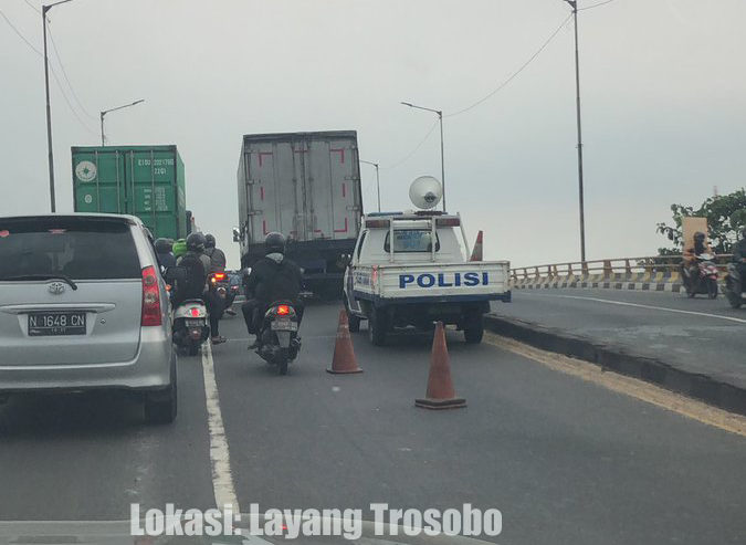 16.50: Info awal: Trailler mogok di lajur kanan Layang Trosobo-Surabaya. Sudah ada Polisi lokasi. (odp-rt)