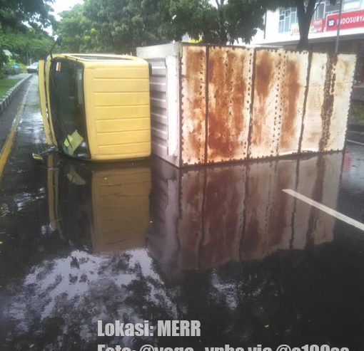 10.47: Update: Mobil box (pada postingan sebelumnya disebut truk) di depan Ruko Icon 21 MERR – Kertajaya masih ada di lokasi. Lalu lintas diatur contraflow. (odp-rt)