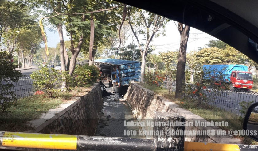 Info awal kecelakaan truk muat kontainer terguling di selokan belakang pas masuk Ngoro Industri Mojokerto. Belum diketahui sebabnya. Info sudah diteruskan ke petugas. (odp-hm)