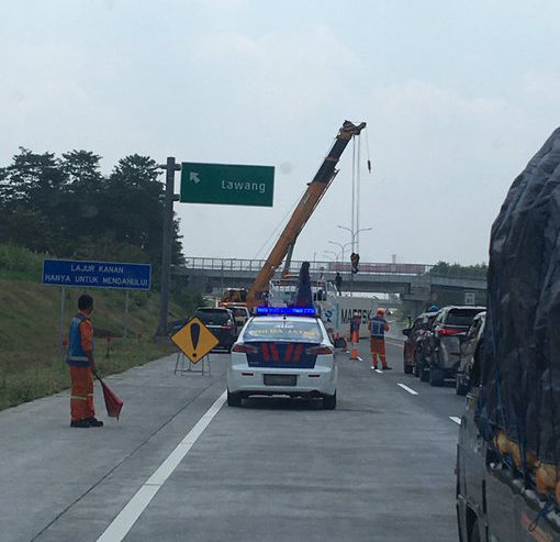 12.17: Update: Proses evakuasi trailler terguling di Tol Singosari – Pandaan KM 81 lajur kiri. Hindari lajur kiri, Kawan. (odp-rt)