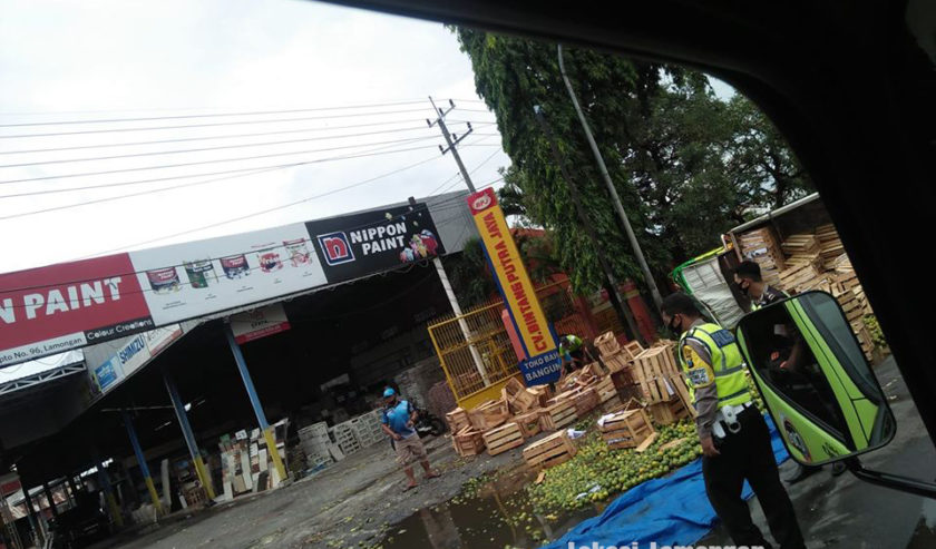 12.02: Update: Sudah ada polisi di lokasi truk muat jeruk yang terguling di Lamongan. Lalu lintas di contraflow, ada antrean sekitar 500 meter. (odp-rt)
