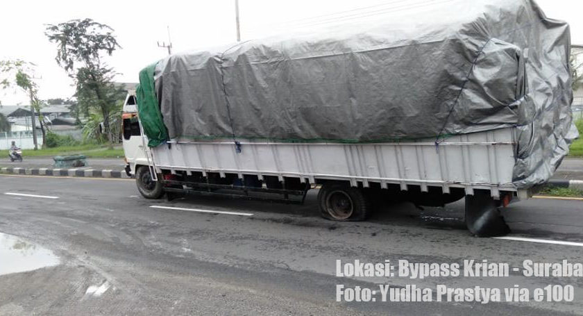 16.37: Update: Truk fuso pecah ban setelah TL Bypass Krian – Surabaya lajur kanan masih ada di lokasi. Lalu lintas masih belum terdampak, kendaraan yang lewat di lokasi ambil lajur kanan. (odp-rt)