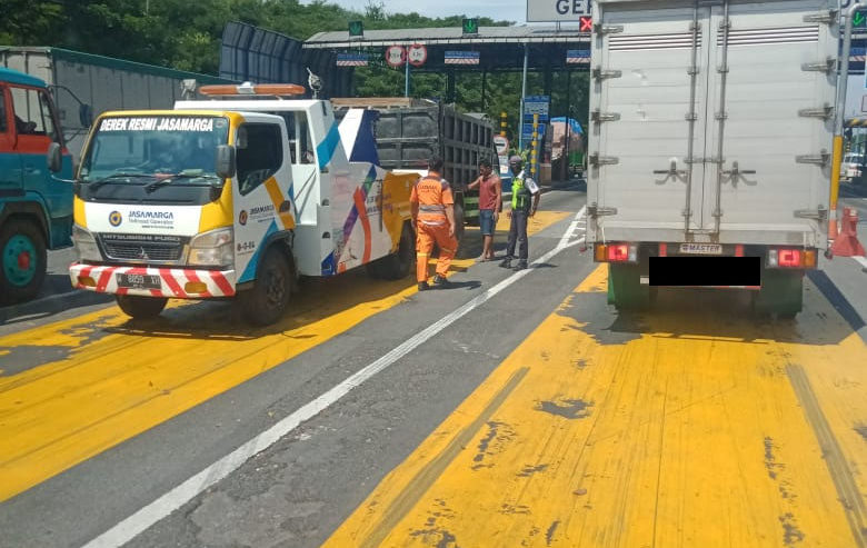 10.59: Truk bermasalah di gate tol Sidoarjo, dalam proses evakuasi. Lalu lintas PADAT. (odp-ts)