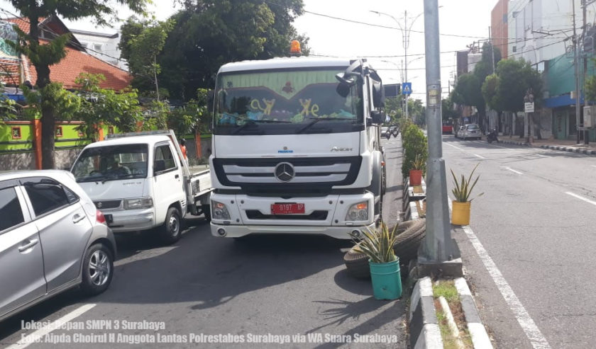 15.07: Aipda Choirul H Anggota Lantas Polrestabes Surabaya mengabarkan, ada truk pengangkut sampah mengalami pecah ban di depan SMP Negeri 3 Surabaya, masih proses penggantian ban. Lalu lintas lancar. (odp-ts)
