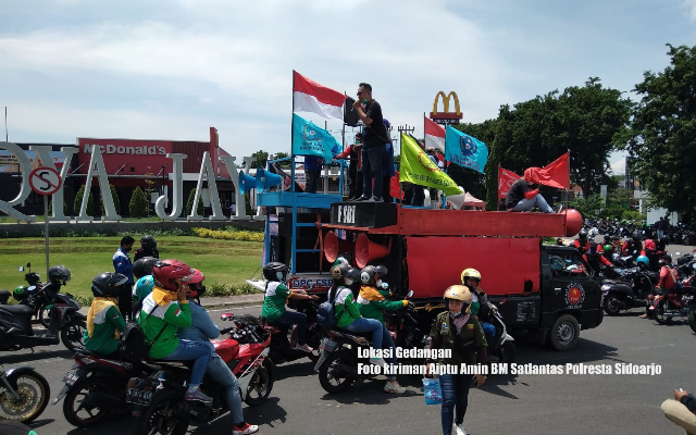 1. Ada unjukrasa di depan Puri Surya Jaya Gedangan. Pengunjukrasa sedang berorasi. Tujuan akhir ke Kantor Pemkab Sidoarjo