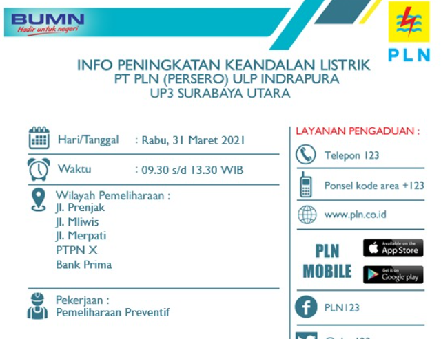 #InfoPLN: Rabu besok (31/3/2021) ada agenda pemeliharaan jaringan listrik di PLN UP3 Surabaya Utara