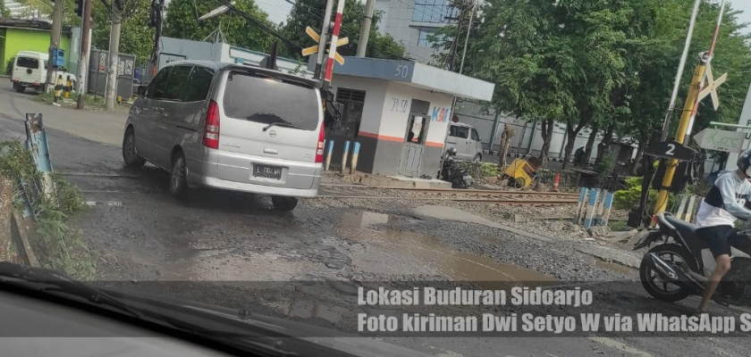 Kondisi jalan di perlintasan kereta api depan Japfa Raya Buduran Sidoarjo, rusak dan membentuk kubangan. Dwi Setyo pendengar SS melaporkan, kondisi jalan ini sudah terjadi satu tahun lalu. Waspada melintas di lokasi, Kawan (odp-hm)