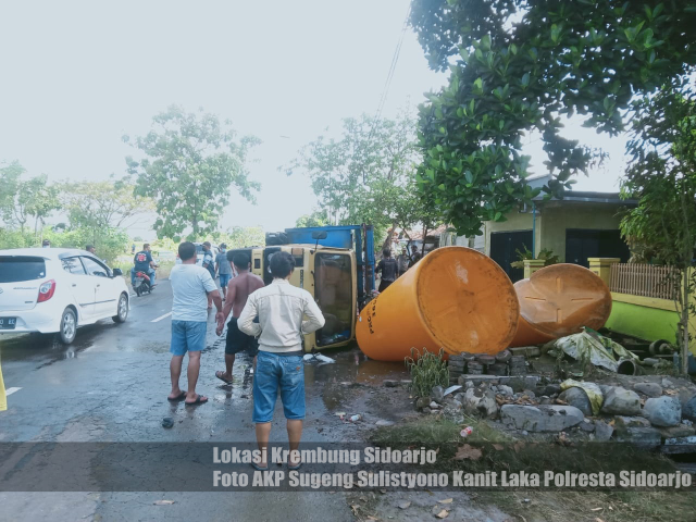 13.55: AKP Imam Kapolsek Krembung Sidoarjo mengatakan pihaknya sudah menangani #kecelakan dump truck bermuatan tandon berisi HCL yang terguling di Desa Keret, Krembung, Sidoarjo. Petugas bersama warga sekitar menyiram cairan HCL dengan air sungai.