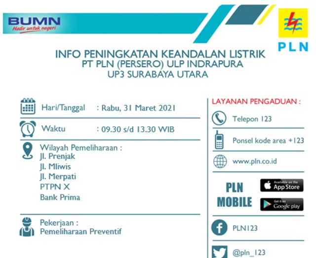 #InfoPLN: Rabu besok (31/3/2021) ada agenda pemeliharaan jaringan listrik di PLN UP3 Surabaya Utara