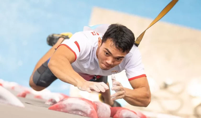 Kiromal Katibin Atlet Panjat Tebing Indonesia, menyegel medali perunggu nomor speed putra pada Piala Dunia Panjat Tebing atau IFSC World Cup 2024 Wujiang, China.