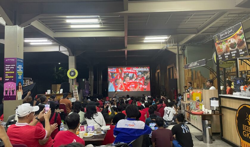 Ratusan masyarakat memenuhi Food Traffic Suara Surabaya Centre (SSC) untuk nonton bareng (nobar) Tim Nasional (Timnas) Indonesia U-23 melawan Uzbekistan U-23 di semifinal Piala Asia U-23 Qatar.