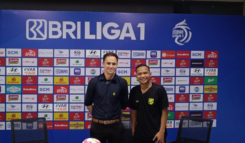 Paul Munster pelatih dan Oktafianus Fernando pemain Persebaya saat berada di ruang konferensi pers Stadion Gelora Bung Tomo (GBT) Surabaya, Jumat (22/11/2024). Foto: Risky suarasurabaya.net