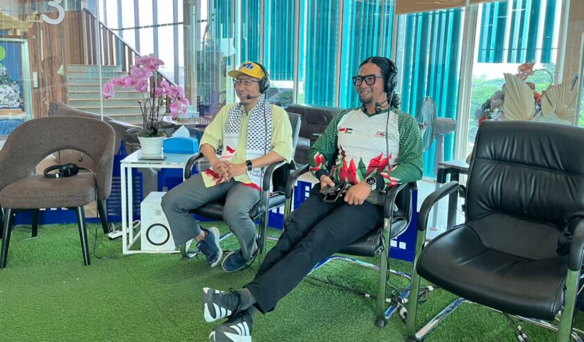 Suryo Guritno (kiri) Koordinator Pelaksana 1000 KM Ride for Palestine bersama Wirawan Dwi Humas 1000 KM Ride for Palestine saat berbincang-bincang di Radio Suara Surabaya, Senin (3/11/2025). Foto: Billy suarasurabaya.net