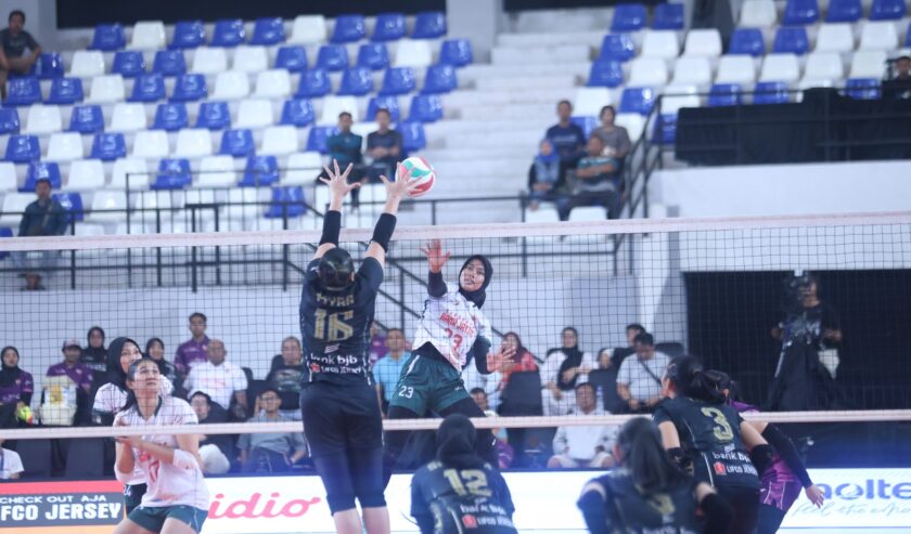Aksi para pemain Bank Jatim dalam pertandingan melawan Rajawali O2C Livoli Divisi Utama 2025 Putaran Reguler Pertama di GOR Nambo, Tangerang. Foto: PBVSI
