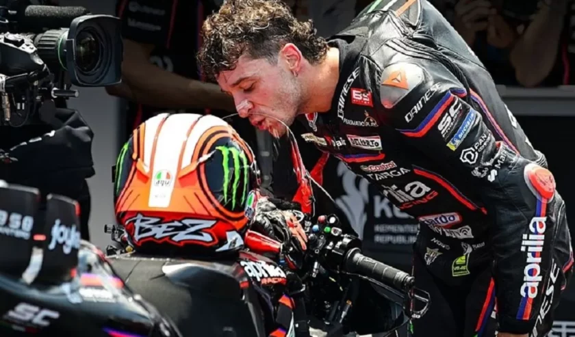 Marco Bezzecchi, pembalap Aprilia Racing mencium motor Aprilia RS-GP25. Foto: X/MotoGP