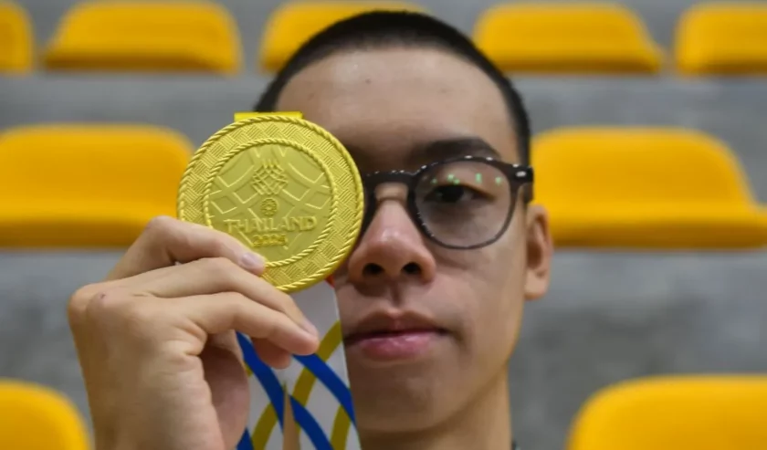 Jason Donovan Yusuf perenang Indonesia memamerkan medali emas setelah mencatatkan waktu 25,36 detik pada nomor 50 meter gaya punggung putra SEA Games 2025 di SAT Swimming Pool, Bang Kapi, Bangkok, Kamis (11/12/2025). Foto: Antara