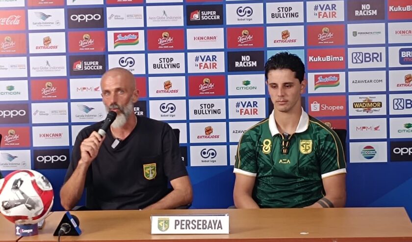 Eduardo Perez pelatih bersama Bruno Moreira pemain Persebaya dalam after match press conference di Stadion Gelora Bung Tomo (GBT) Surabaya, pada Sabtu (22/11/2025). Foto: Risky suarasurabaya.net