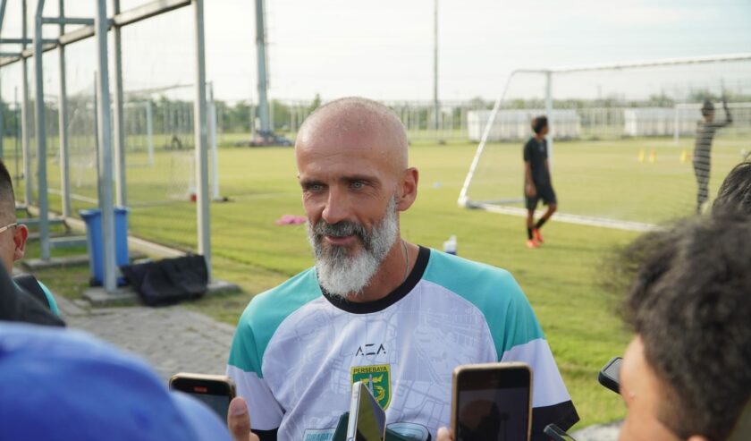 Eduardo Perez pelatih Persebaya Surabaya ketika memberikan keterangan kepada awak media di Lapangan ABC kompleks Stadion Gelora Bung Tomo (GBT), Senin (13/10/2025). Foto: M. Irfan Azhari Mg suarasurabaya.net