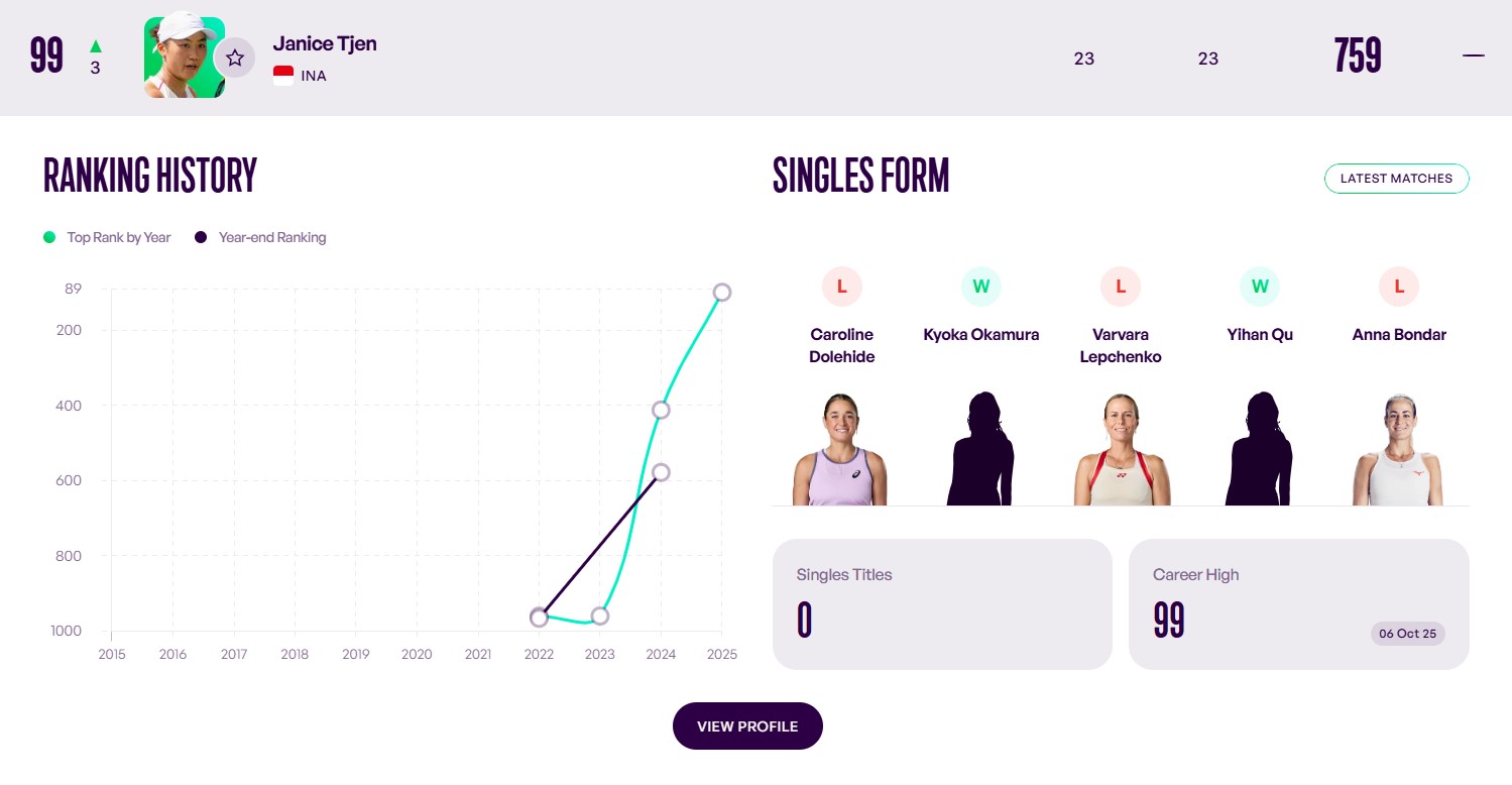 Menurut peringkat WTA, Senin (6/10/2025), Janice saat ini berada di peringkat No. 99 dunia, tertinggi dalam kariernya, dengan catatan menang/kalah 67/14.
