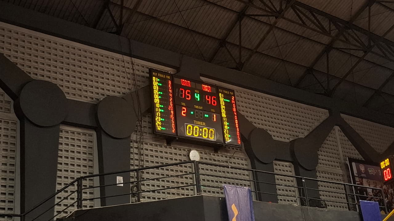 Hasil skor akhir pertandingan derbi tim putra UNAIR vs UBAYA dalam gelaran Liga Mahasiswa Basketball 2025 Surabaya, di Gor CLS Kertajaya, Sabtu (1/11/2025). Foto: Akira suarasurabaya.net