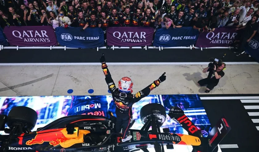 Pebalap Red Bull Max Verstapp en (tampak punggung) berselebrasi seusai keluar sebagai juara balapan Formula 1 Grand Prix Qatar di Sirkuit Losail, Qatar, Minggu (30/11/2025) waktu setempat. Foto: X @F1