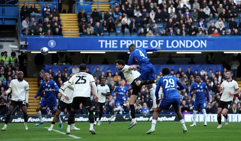 Sundulan Tosin Adarabioyo bek Chelsea berhasil merobek gawang Port Vale. The Blues menang 7-0 dalam laga perempat final Piala FA di Stamford Bridge pada Sabtu (4/4/2026) malam. Foto: Chelsea FC