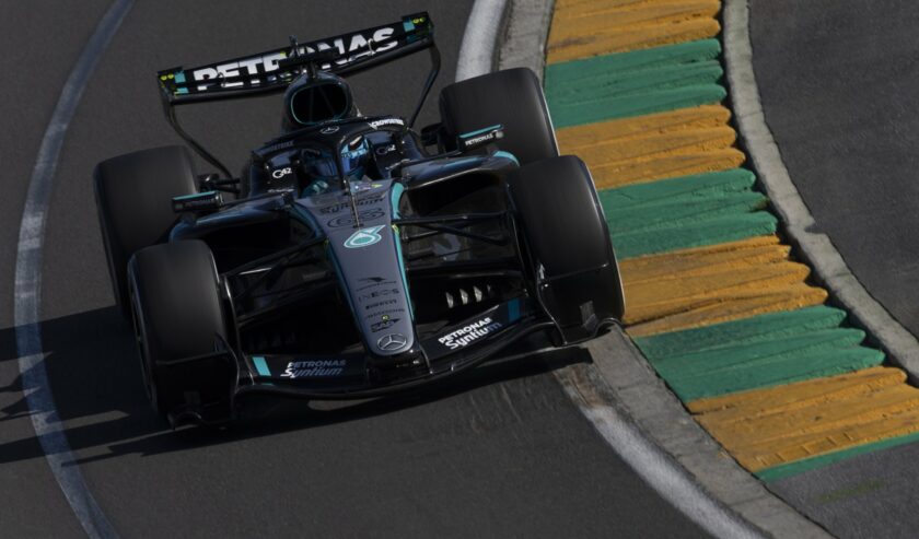George Russell pembalap Mercedes-AMG Petronas melaju dalam sesi kualifikasi Grand Prix Australia pada Sabtu (7/3/2026). Foto: Crash